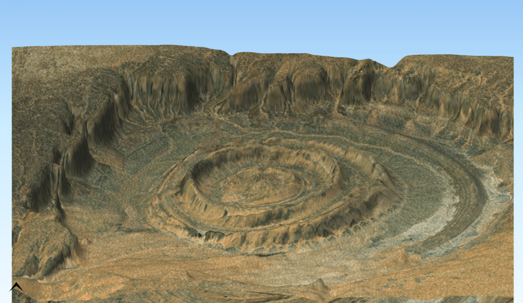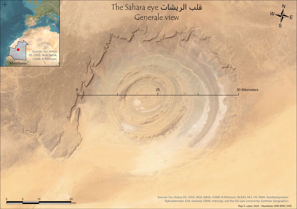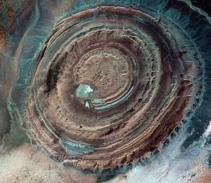 L’Œil du Sahara (قلب الريشات), également connu sous le nom de « Structure de Richat », est une formation géologique remarquable située en Mauritanie. Il s’agit d’une formation circulaire de près de 50 km de diamètre, caractérisée par des anneaux concentriques de couches de roches. Initialement considérée comme un cratère d’impact, elle est en réalité le résultat d’un processus géologique complexe appelé « dôme anticlinal érodé ». Elle est visible de l’espace. Il s’agit d’une structure unique sur la planète Terre.