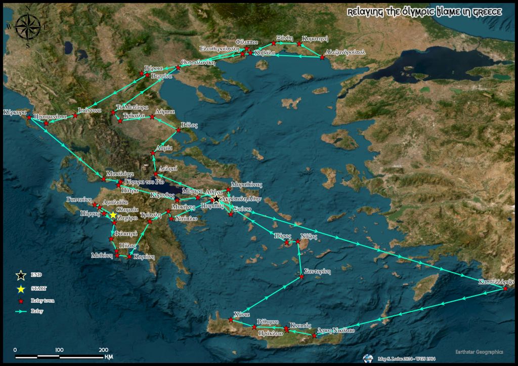 En fouillant sur la toile depuis la France et la Grèce (ευχαριστώ, Eva!), vous ne trouverez pas de carte montrant le relais de la flamme olympique sur le sol grec. Alors comme je voulais visualiser la route de la flamme sur le sol de ses origines, j’en ai fait une rapidement.