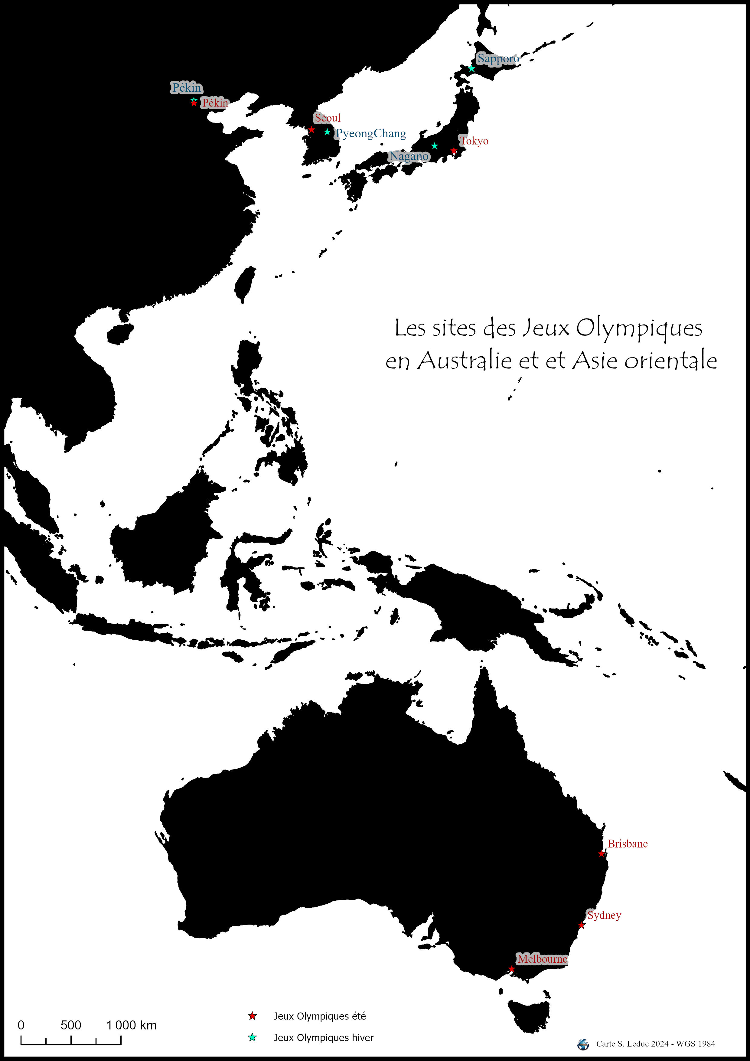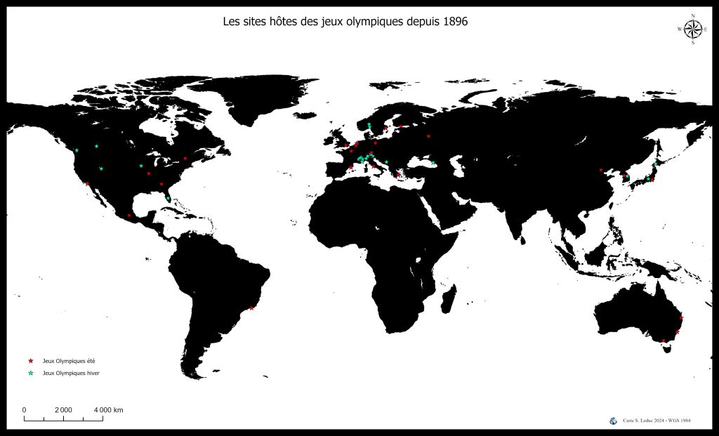 Si on élargit le thème à tous les jeux olympiques (été et hiver) organisés depuis 1896, il est intéressant de visualiser la localisation des villes hôtes. Une liste ne montrera pas aisément la disparité. Avec la carte, nous voyons que l’Europe est très représentée et l’Afrique pas du tout.