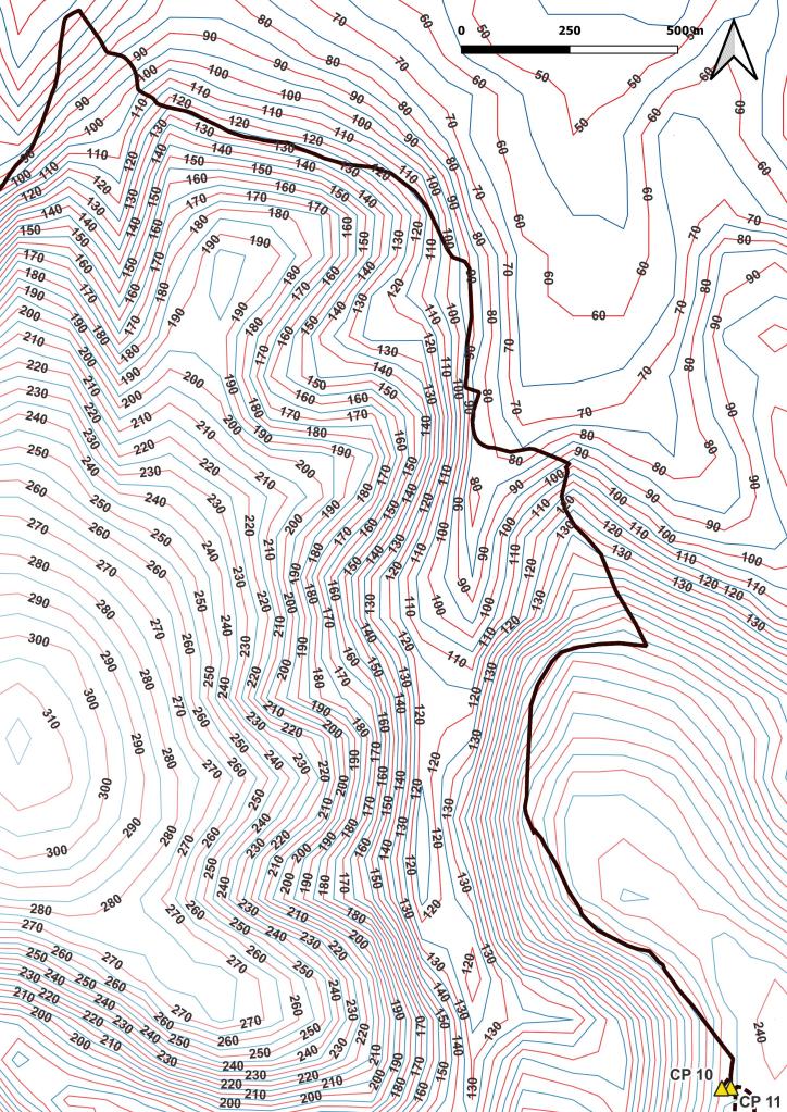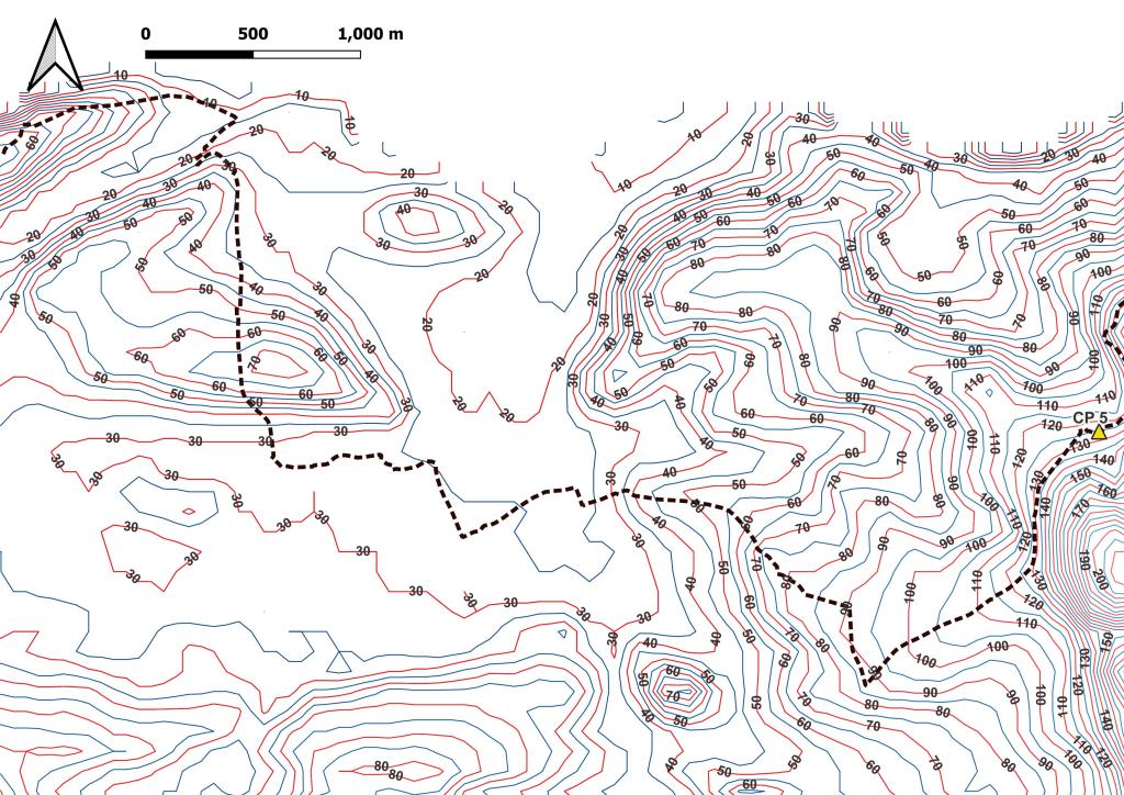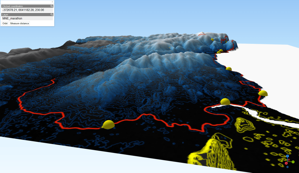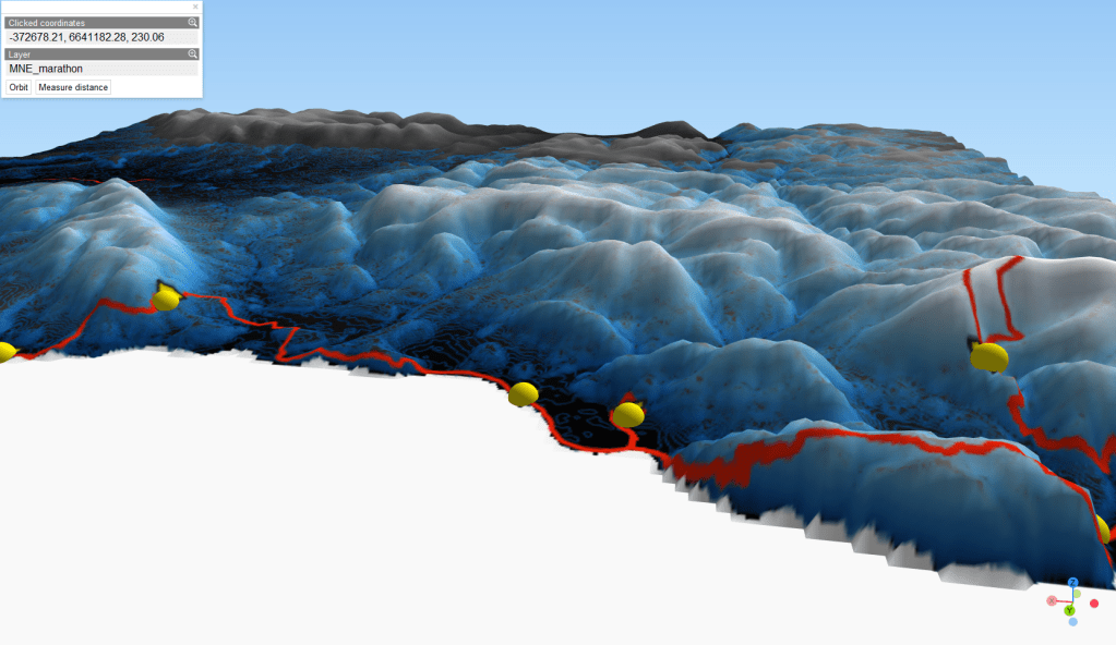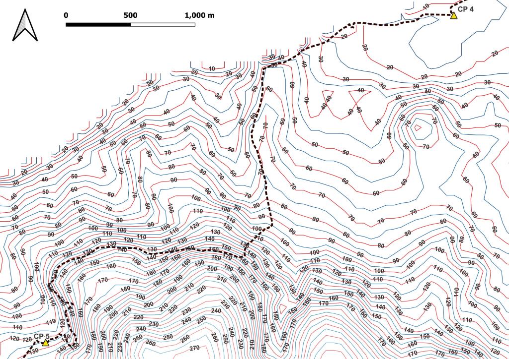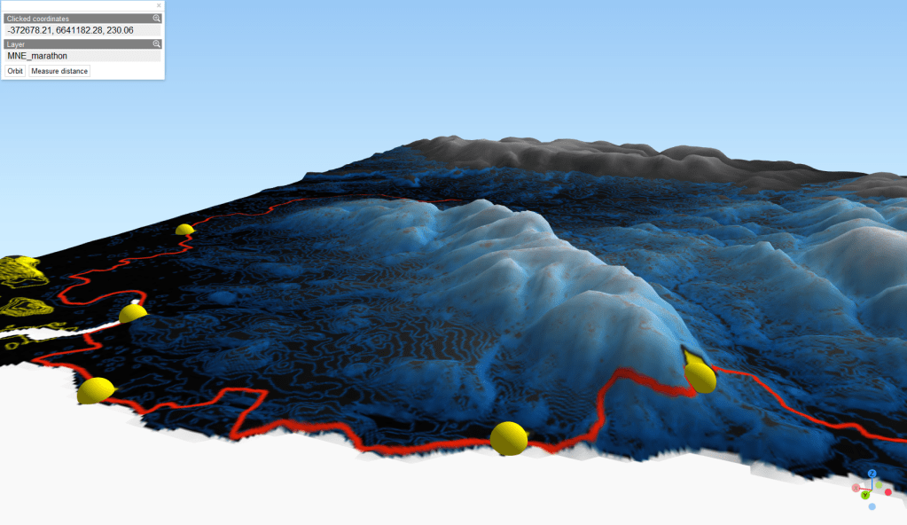 Ensuite, travail sur le MNE (Modèle Numérique d’Elevation) pour en extraire les courbes de niveau. La préparation se fait aussi en visualisation les zone les reliefs du parcours. Ici, on peut voir que jusqu’au CP 4, le terrain est relativement plat; après, ça se gatte!