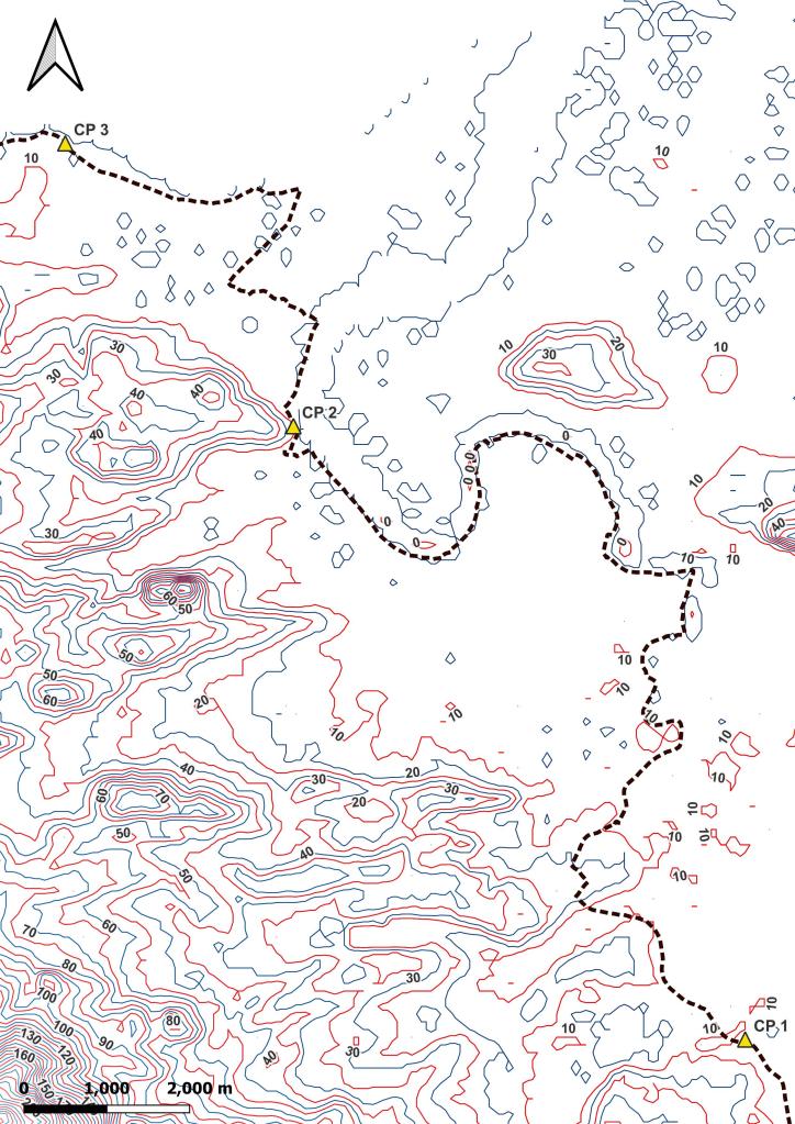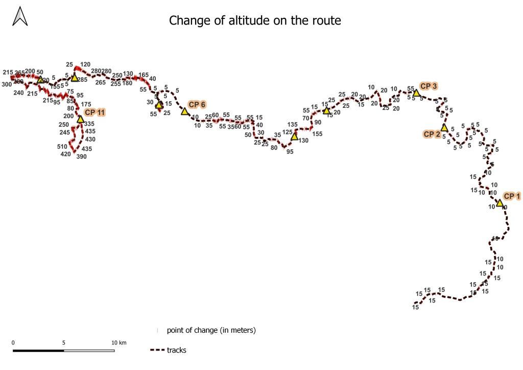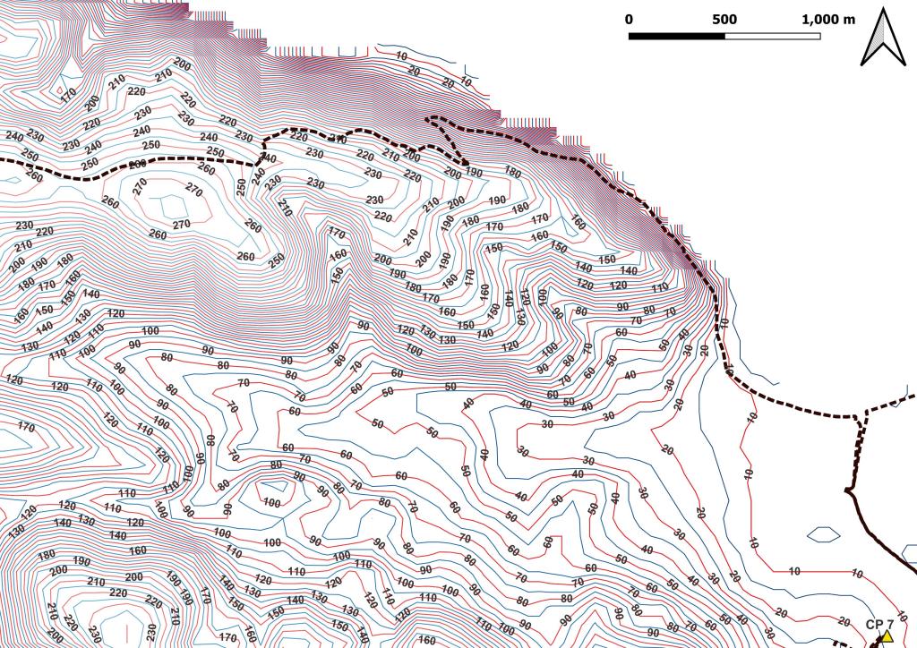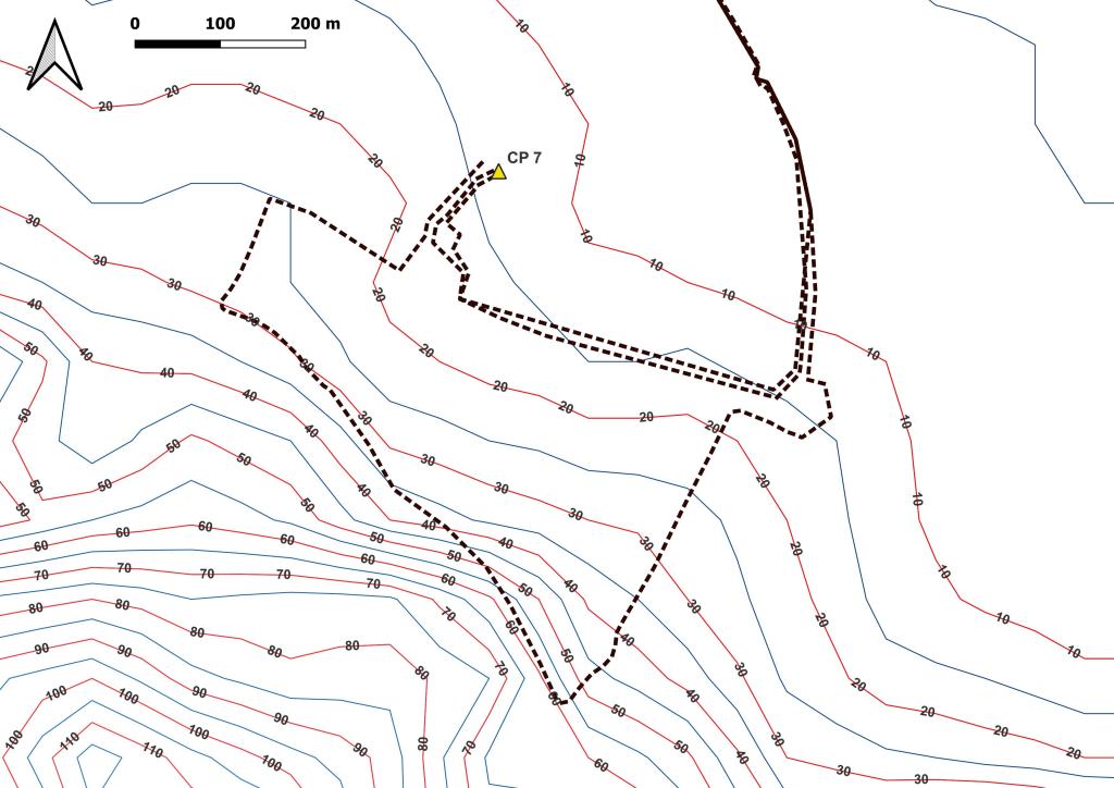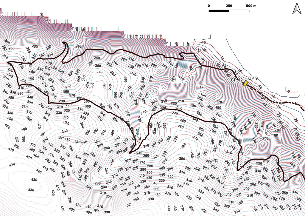 Ensuite, travail sur le MNE (Modèle Numérique d’Elevation) pour en extraire les courbes de niveau. La préparation se fait aussi en visualisation les zone les reliefs du parcours. Ici, on peut voir que jusqu’au CP 4, le terrain est relativement plat; après, ça se gatte!